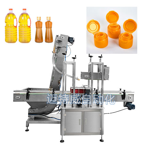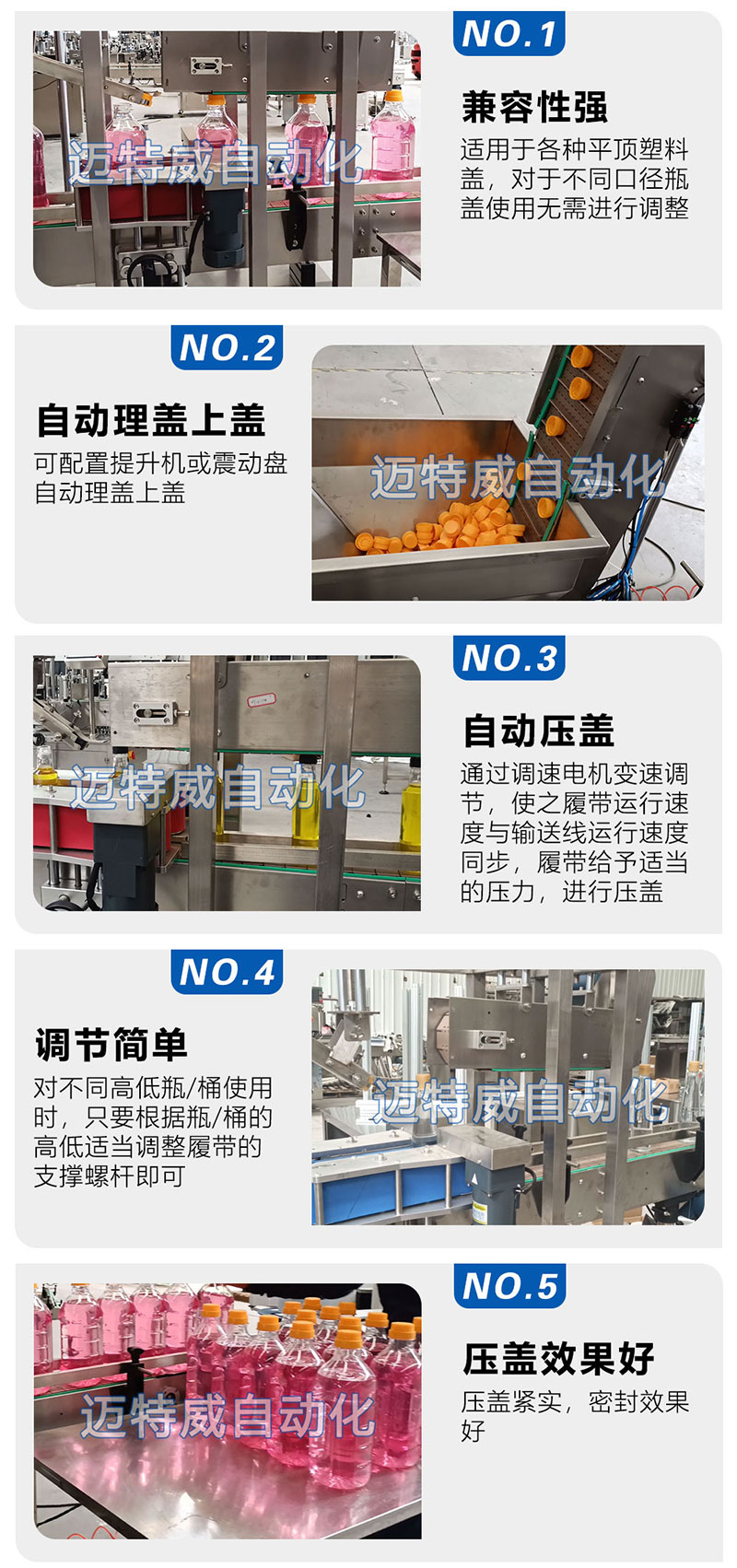 本機適用于各種平頂塑料蓋,使用范圍廣、點地面積小,與灌裝機、上蓋機、裝箱機等聯機使用,完成后道包裝生產線。