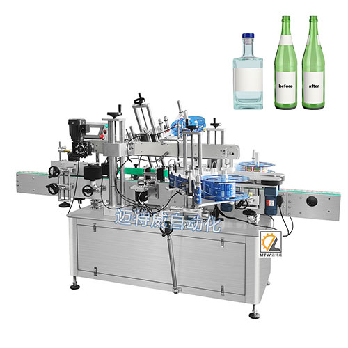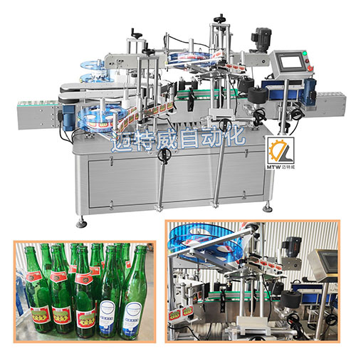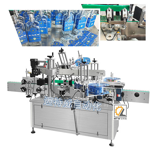 這款三面貼標機針對于圓瓶的對側兩面+頸部設計,可同時貼三張標,也可用于方瓶貼標,一張標貼三個面。