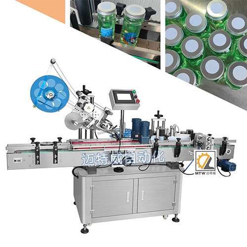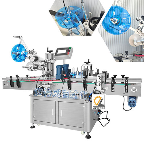 氣動圓瓶上平面+側面貼標機為特制機器,共有兩個貼標頭:一個貼標頭在頂部,另一個貼標頭在側面,它可以給瓶子、罐子貼上2張標簽,一張貼在頂部,另一張貼在側面。可實現頂標和側標的定位貼標。
