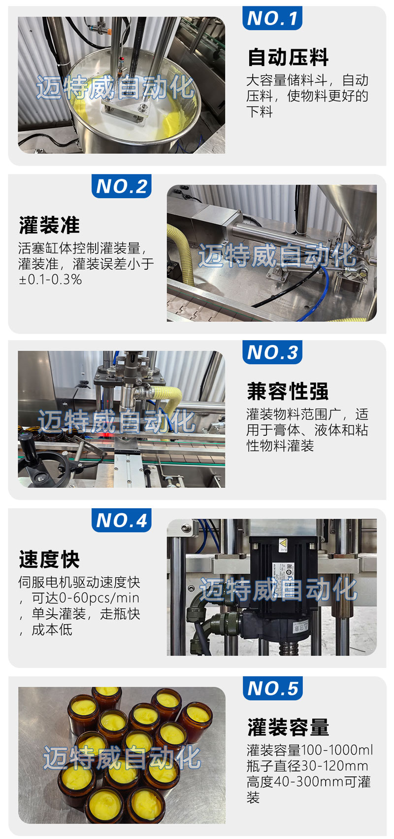 單頭伺服灌裝機采用伺服活塞定量灌裝,單頭灌裝,設備投入少,走瓶速度快,效率高,灌裝容量100-1000ml,適用于醬料、膏體、液體和粘性物料灌裝。