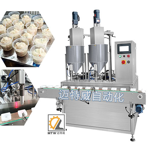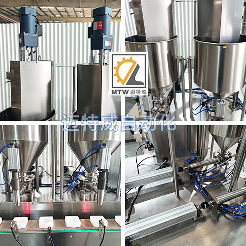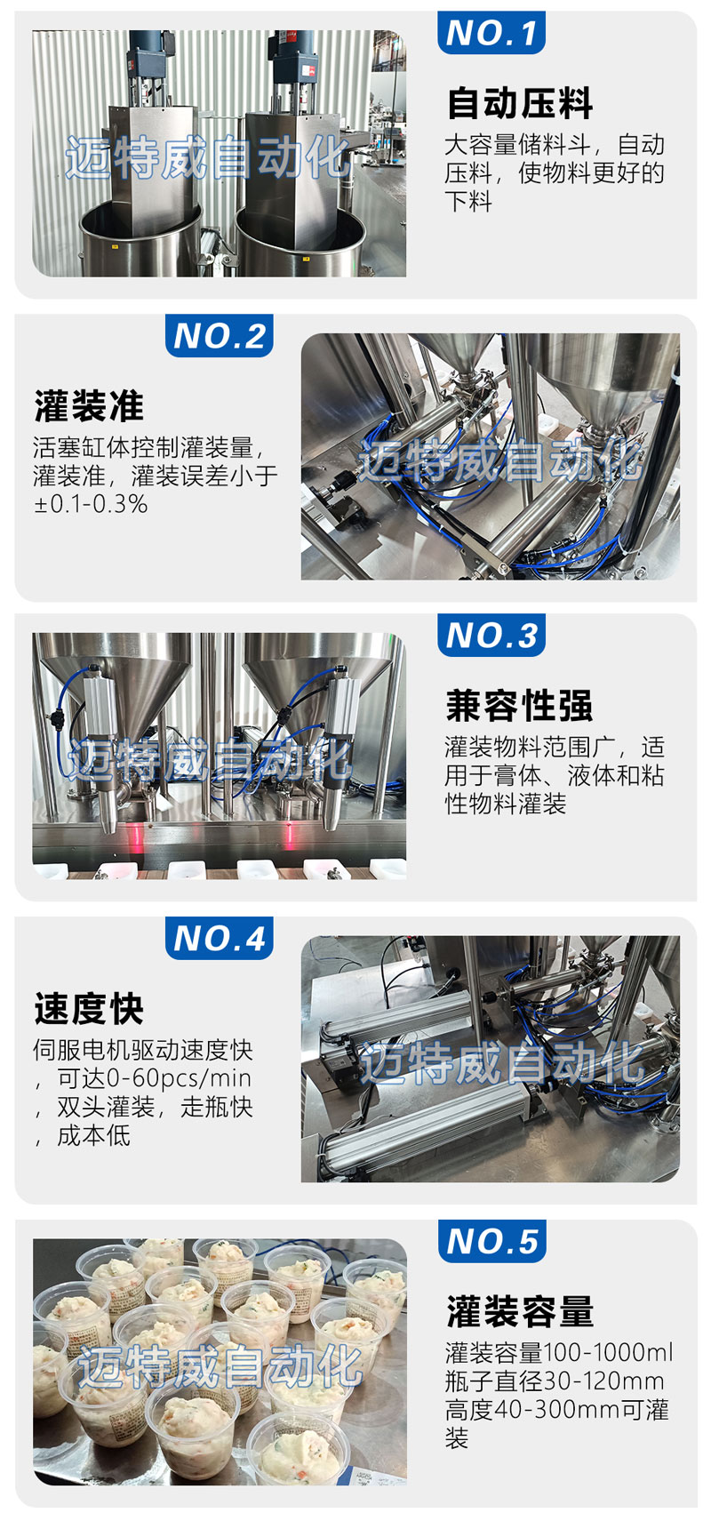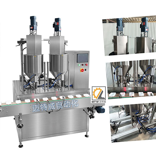 雙頭伺服灌裝機采用伺服活塞定量灌裝,雙頭灌裝,設備投入少,走瓶速度快,效率高,灌裝容量100-1000ml,適用于醬料、膏體、液體和粘性物料灌裝。