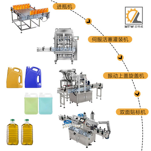 潤(rùn)滑油/玻璃水灌裝生產(chǎn)線:進(jìn)瓶機(jī)+伺服活塞灌裝機(jī)+4輪上蓋旋蓋機(jī)+雙面貼標(biāo)機(jī)
