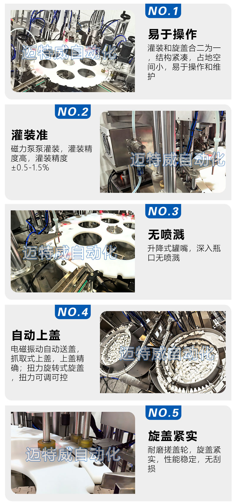 ● 采用高精度磁力泵泵定量灌裝,電磁振動自動送蓋,伺服驅動旋蓋,具有無瓶不灌裝的功能;