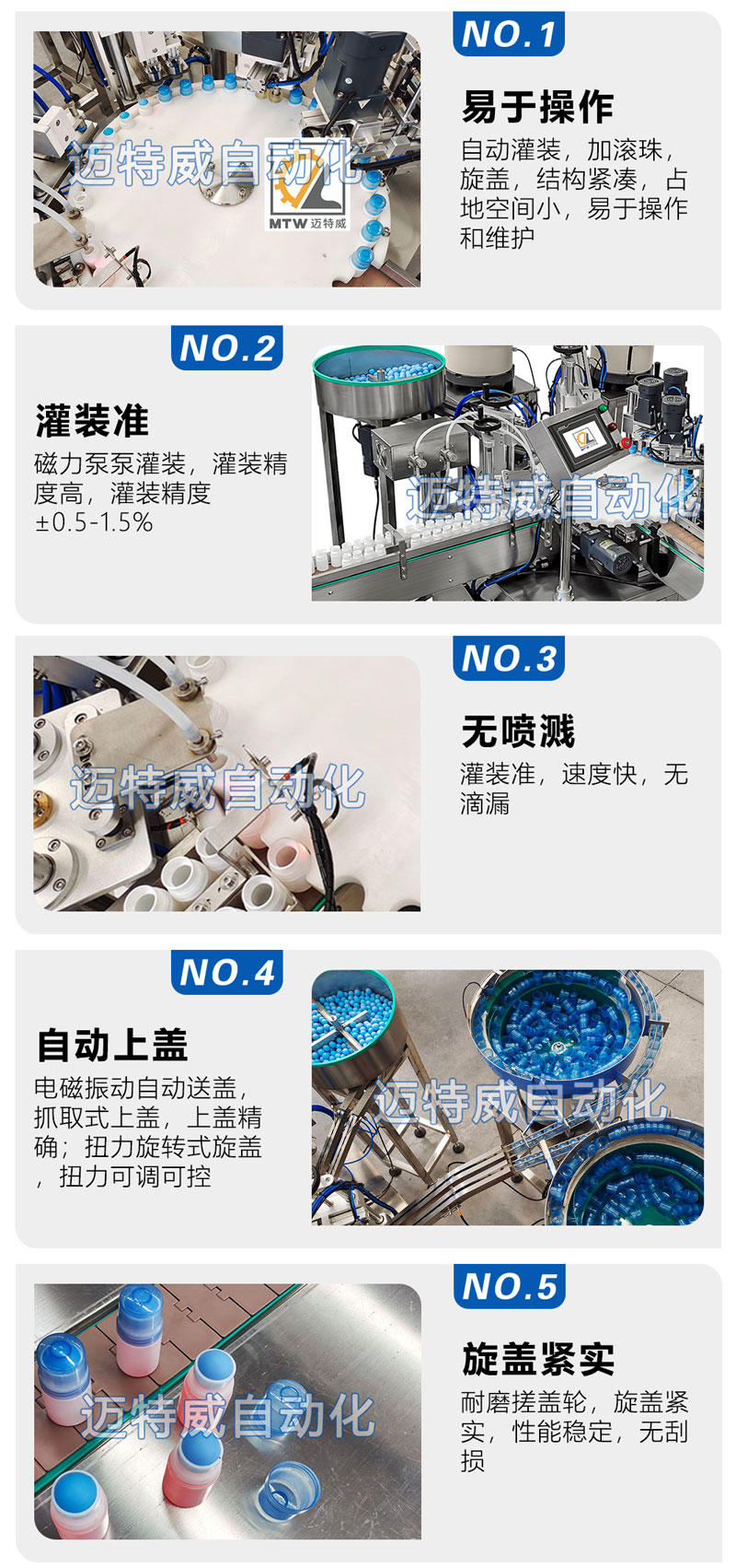 ● 采用高精度磁力泵泵定量灌裝,電磁振動(dòng)自動(dòng)送蓋,伺服驅(qū)動(dòng)旋蓋,具有無(wú)瓶不灌裝的功能;